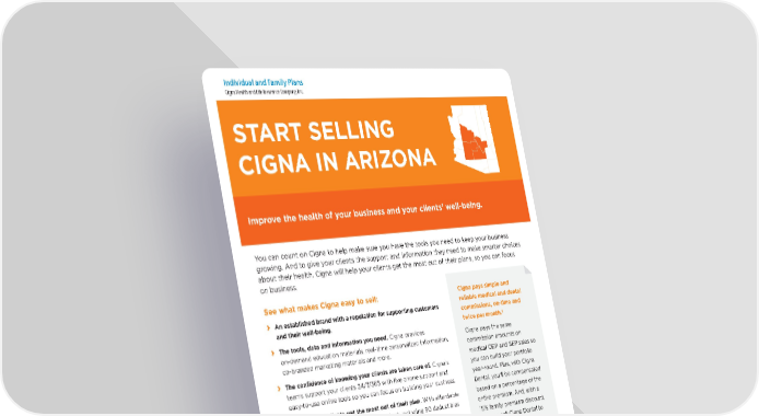 942561 10/21 © 2021 Cigna. Some content provided under license. START SELLING CIGNA IN ARIZONA Improve the health of your business and your clients’ well-being. Call the Cigna Broker Support Team to get appointed. 877.244.6215 • Monday–Friday • 8:00 am–8:00 pm ET Cigna pays simple and reliable medical and dental commissions, on-time and twice per month. 2 Cigna pays the same commission amounts on medical OEP and SEP sales so you can build your portfolio year-round. Plus, with Cigna Dental, you’ll be compensated based on a percentage of the entire premium. And, with a 15% family premium discount, you can sell Cigna Dental to eligible dependents. 3 You can count on Cigna to help make sure you have the tools you need to keep your business growing. And to give your clients the support and information they need to make smarter choices about their health. Cigna will help your clients get the most out of their plans, so you can focus on business. See what makes Cigna easy to sell: › An established brand with a reputation for supporting customers and their well-being. › The tools, data and information you need. Cigna provides on-demand education materials, real-time personalized information, co-branded marketing materials and more. › The confidence of knowing your clients are taken care of. Cigna’s teams support your clients 24/7/365 with live phone support and easy-to-use online tools so you can focus on building your business. › Helping your clients get the most out of their plan. With affordable plan options to fit their needs and budget, including $0 deductibles and benefits. 1 › Dedicated broker support team. Cigna is here for you in the moments that matter. Available Monday–Friday, 8:00 am–8:00 pm ET. › Broad product portfolio of competitive products to sell. Including medical, dental, vision, hearing and Medicare – to give you the flexibility to address your clients’ health needs and sell year-round. Individual and Family Plans Cigna Health and Life Insurance Company, Inc. 1. Based on internal data for 2021. Final premium amount is after any applicable subsidy, based on household size and income, from the federal government is applied. 2. Commission payment releases subject to minimum threshold. EFT payment will release with $5 or more, and mailed paper checks will release with $300 or more. 3. For each subsequent customer added to a primary policy, a 15% discount is applied to the standard rate. Discount is automatically applied in the quote tool.