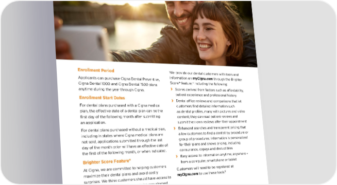 Enrollment Period Applicants can purchase Cigna Dental Preventive, Cigna Dental 1000 and Cigna Dental 1500 plans anytime during the year through Cigna. Enrollment Start Dates For dental plans purchased with a Cigna medical plan, the effective date of a dental plan can be the first day of the following month after submitting an application. For dental plans purchased without a medical plan, including in states where Cigna medical plans are not sold, applications submitted through the last day of the month prior will have an effective date of the first of the following month, or when indicated. Brighter Score Feature 4 At Cigna, we are committed to helping customers maximize their dental plans and avoid costly surprises. We think customers should have access to some of the information they may be accustomed to: conveniences such as insightful customer reviews and transparent pricing. We provide our dental customers with tools and information on myCigna.com through the Brighter Score ® feature, 4 including the following: › S cores derived from factors such as affordability, patient experience and professional history › Dental offic e reviews and comparisons that let customers find detailed information such as dentist profiles, many with pictures and video content; they can read patient reviews and submit their own reviews after their appointment › Enhanc ed searches and transparent pricing that allow customers to find a dentist by procedure or group of procedures; information is personalized for their plans and shows pricing, including coinsurance, copays and deductibles › Eas y access to information anytime, anywhere – from a computer, smartphone or tablet Customers will need to be registered at myCigna.com to use these tools. 5 DENTAL 4. C igna makes no representations or warranties as to the quality or accuracy of the information or services of the Brighter Score. The Brighter Score is not a guarantee of the quality of care that will be delivered to individual customers. Customers are encouraged to consider all relevant factors and to speak with their treating dentist when choosing where to receive dental care. 5. Customers under age 13 (and/or their parent/guardian) will not be able to register at myCigna.com.