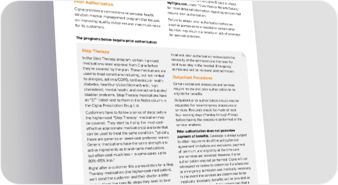 MEDICAL PLANS CONTINUED Step Therapy In the Step Therapy program, certain high-cost medications need approval from Cigna before they’re covered by the plan. These medications are used to treat conditions including, but not limited to allergies, asthma/COPD, cardiovascular health, diabetes, heartburn/ulcer/stomach acid, high cholesterol, mental health, and overactive bladder/ bladder problems. Step Therapy medications have an “ST” listed next to them in the Notes column in the Cigna Prescription Drug List. Customers have to follow a series of steps before the higher-cost “Step Therapy” medication may be covered. They start by trying the most cost- effective appropriate medication(s) available that can be used to treat the same condition. Typically, these are generics or lower-cost preferred brands. Generic medications have the same strength and active ingredients as brand-name medications but often cost much less – in some cases, up to 80%–85% less. 3 Right after a customer fills a prescription for a Step Therapy medication (the higher-cost medication), we’ll send the customer and their doctor a letter that outlines the specific steps they need to take before their next refill to receive coverage. You can find more information in the “Documents and Forms” section of CignaforBrokers.com . Inpatient Admissions Prior authorization is required for all nonemergency inpatient admissions, and certain other admissions, to be eligible for benefits. Inpatient prior authorization reviews both the necessity of the admission and the need for continued stay in the hospital. Emergency admissions will be reviewed post-admission. Outpatient Procedures Certain outpatient procedures and services require review and prior authorization to be eligible for benefits. Outpatient prior authorization should only be requested for nonemergency procedures or services. Requests should be made at least four working days (Monday through Friday) before having the procedure performed or the service rendered. Prior authorization does not guarantee payment of benefits. Coverage is always subject to other requirements of the policy/service agreement limitations and exclusions, payment of premium, and eligibility at the time care and services are provided. However, if prior authorization was not performed, Cigna will use retrospective review to determine if a scheduled or emergency admission was medically necessary. In the event the services are determined to be medically necessary, benefits will be provided as described in the policy. If it is determined that a service was not medically necessary, the insured person is responsible for payment of the charges for those services. The programs below require prior authorization: This means if a customer wants to change plans during a Special Enrollment Period, they may need to select a new plan within the same plan category as their current plan or wait until the next Open Enrollment (if they want to change to a plan in a different category). Prior Authorization Cigna provides a comprehensive personal health solution medical management program that focuses on improving quality outcomes and maximizes value for its customers. Prior authorization can be obtained by the policyholder, a family member or the provider by calling the number on the back of the ID card. A customer may call the Member Services number on the back of the Cigna ID card or check myCigna.com , under “View Medical Benefit Details,” for more detailed information regarding services that require prior authorization. Failure to obtain prior authorization before an elective admission to a hospital or certain other facilities may result in a penalty or lack of coverage for services provided. 3. U .S. Food and Drug Administration (FDA). “Generic Drugs: Questions and Answers.” Last updated 03/16/21. www.fda.gov/drugs/questions-answers/generic-drugs- questions-answers .