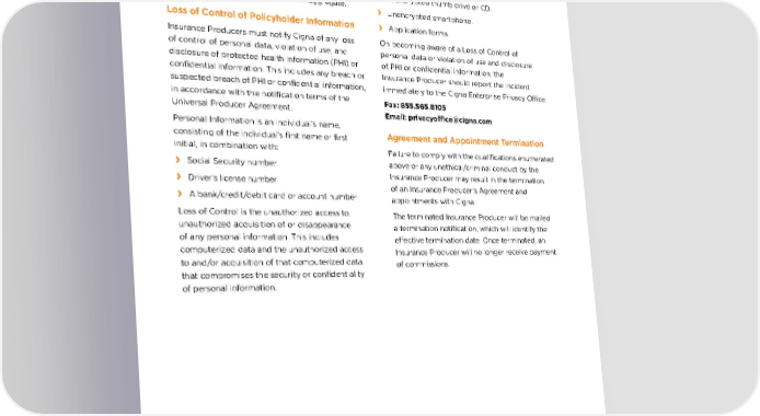 Errors and Omissions Per the terms of the Universal Producer Agreement, all Insurance Producers must, at all times during the term of the Agreement, maintain professional liability errors and omissions insurance not less than $50,000 per occurrence and $250,000 annual aggregate. Loss of Control of Policyholder Information Insurance Producers must notify Cigna of any loss of control of personal data, violation of use, and disclosure of protected health information (PHI) or confidential information. This includes any breach or suspected breach of PHI or confidential information, in accordance with the notification terms of the Universal Producer Agreement. Personal Information is an individual’s name, consisting of the individual’s first name or first initial, in combination with: › Social Security number . › Driv er’s license number. › A bank/ credit/debit card or account number. Loss of Control is the unauthorized access to, unauthorized acquisition of or disappearance of any personal information. This includes computerized data and the unauthorized access to and/or acquisition of that computerized data that compromises the security or confidentiality of personal information. Examples of Loss of Control include an intrusion of your computer system by an unauthorized third party and lost or stolen: › Unencrypt ed laptop. › Unencrypt ed thumb drive or CD. › Unencrypt ed smartphone. › Applica tion forms. On becoming aware of a Loss of Control of personal data or violation of use and disclosure of PHI or confidential information, the Insurance Producer should report the incident immediately to the Cigna Enterprise Privacy Office. Fax: 855.565.8105 Email: [email protected] Agreement and Appointment Termination Failure to comply with the qualifications enumerated above or any unethical/criminal conduct by the Insurance Producer may result in the termination of an Insurance Producer’s Agreement and appointments with Cigna. The terminated Insurance Producer will be mailed a termination notification, which will identify the effective termination date. Once terminated, an Insurance Producer will no longer receive payment of commissions. PRODUCER QUALIFICATIONS CONTINUED