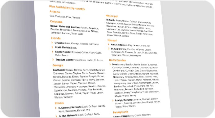 STATE SPECIFIC Comparison Grids For individual medical plans by state market, please go to CignaforBrokers.com and access the Instructional Materials section in the Resource Center. You’ll see a full view of plan offerings so you can easily compare plans by metal level, premiums and more. The website also has information and grids about dental plans as well as support information about value-add features of the plans. Please note that not all plans are available in all markets, and some states have specific restrictions or limitations. Plan Availability (by county) Arizona Gila, Maricopa, Pinal, Yavapai Colorado Denver Metro and Boulder: Adams, Arapahoe, Boulder, Broomfield, Denver, Douglas, El Paso, Jefferson, Larimer, Teller, Weld Florida › Orlando: Lake, Orange, Osceola, Seminole › North Florida: Leon › South Florida: Broward, Collier, Miami-Dade, Palm Beach › Treasure Coast: Indian River, Martin, St. Lucie Georgia Southeast: Barrow, Bartow, Butts, Chattahoochee, Cherokee, Clarke, Clayton, Cobb, Coweta, Dawson, Dekalb, Douglas, Elbert, Fayette, Forsyth, Fulton, Gilmer, Greene, Gwinnett, Harris, Henry, Jackson, Jasper, Lamar, Macon, Madison, Marion, Meriwether, Morgan, Muscogee, Newton, Oconee, Oglethorpe, Paulding, Pickens, Pike, Rockdale, Spalding, Stewart, Talbot, Taylor, Troup, Upson, Walton, Webster Illinois › IL Connect Network: Cook, DuPage, Grundy, Kane, Kankakee, Kendall, Will › IL Plus Network: Cook, DuPage, Kane, Lake, McHenry Kansas › Kansas City: Johnson, Leavenworth, Miami, Wyandotte › Wichita: Butler, Harvey, Sedgwick, Sumner Mississippi Tri South: Alcorn, Benton, Calhoun, Chickasaw, Clay, Covington, Forrest, George, Greene, Hancock, Harrison, Itawamba, Jackson, Jefferson Davis, Jones, Lamar, Lawrence, Lee, Lowndes, Marion, Monroe, Pearl River, Perry, Pontotoc, Prentiss, Stone, Tippah, Tishomingo, Union, Walthall, Webster Missouri › Kansas City: Cass, Clay, Jackson, Platte, Ray › St. Louis: Boone, Franklin, Jefferson, Lincoln, St. Charles, St. Francois, St. Louis, St. Louis City, Ste. Genevieve, Warren, Washington North Carolina › Broad: Avery, Beaufort, Bertie, Bladen, Buncombe, Camden, Carteret, Cherokee, Chowan, Clay, Craven, Cumberland, Currituck, Dare, Duplin, Edgecombe, Gates, Graham, Greene, Halifax, Harnett, Haywood, Henderson, Hertford, Hoke, Hyde, Jackson, Jones, Lenoir, Macon, Madison, Martin, McDowell, Mitchell, Montgomery, Moore, Nash, Northampton, Onslow, Pamlico, Pasquotank, Perquimans, Pitt, Polk, Richmond, Robeson, Rutherford, Sampson, Scotland, Swain, Transylvania, Tyrrell, Washington, Wayne, Wilson, Yancey › Raleigh/Durham: Alamance, Chatham, Durham, Franklin, Granville, Johnston, Lee, Orange, Person, Vance, Wake, Warren Pennsylvania Liberty Valley: Bucks, Chester, Delaware, Montgomery, Philadelphia