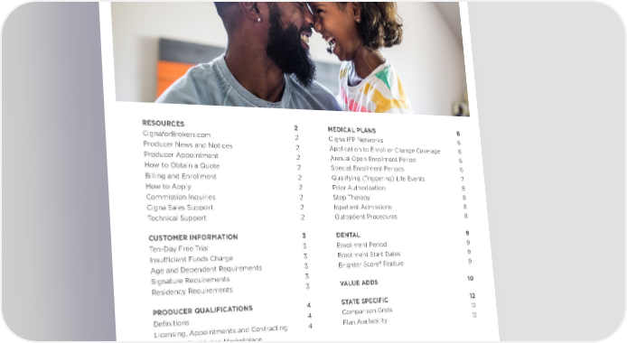 RESOURCES 2 Cigna for Brokers.com 2 Producer News and Notices 2 Producer Appointment 2 How to Obtain a Quote 2 Billing and Enrollment 2 How to Apply 2 Commission Inquiries 2 Cigna Sales Support 2 T echnical Support 2 CUSTOMER INFORMATION 3 Ten-Day Free Trial 3 Insufficient Funds Charge 3 Age and Dependent Requirements 3 Signature Requirements 3 Residency Requirements 3 PRODUCER QUALIFICATIONS 4 Definitions 4 Licensing, Appointments and Contracting 4 Federally Facilitated Marketplace Registration 4 State Health Insurance Exchange Registration 4 Errors and Omissions 5 Loss of Control of Policyholder Information 5 Agreement and Appointment Termination 5 MEDICAL PLANS 6 Cigna IFP Networks 6 Application to Enroll or Change Coverage 6 Annual Open Enrollment Period 6 Special Enrollment Periods 6 Qualifying (Triggering) Life Events 7 Prior Authorization 8 Step Therapy 8 Inpatient Admissions 8 Outpatient Procedures 8 DENTAL 9 Enrollment Period 9 Enrollment Start Dates 9 Brighter Score ® Feature 9 VALUE ADDS 10 STATE SPECIFIC 12 Comparison Grids 12 Plan Availability 12 CONTENTS