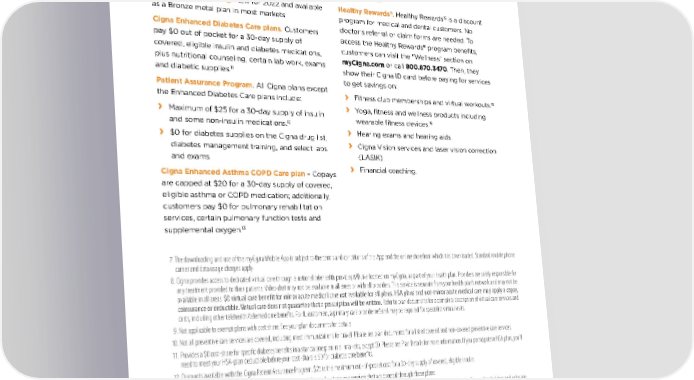 VALUE ADDS CONTINUED Helping customers get the most out of their plan. Preventive care at no additional cost. This includes $0 annual check-ups, flu shot, and cholesterol and blood pressure screenings with in-network providers. 10 HSA-qualified offering. New for 2022 and available as a Bronze metal plan in most markets. Cigna Enhanced Diabetes Care plans. Customers pay $0 out of pocket for a 30-day supply of covered, eligible insulin and diabetes medications, plus nutritional counseling, certain lab work, exams and diabetic supplies. 11 Patient Assurance Program. All Cigna plans except the Enhanced Diabetes Care plans include: › Maximum of $25 for a 30-da y supply of insulin and some non-insulin medications. 12 › $0 for diabetes supplies on the Cigna drug list, diabetes management training, and select labs and exams. Cigna Enhanced Asthma COPD Care plan – Copays are capped at $20 for a 30-day supply of covered, eligible asthma or COPD medication; additionally, customers pay $0 for pulmonary rehabilitation services, certain pulmonary function tests and supplemental oxygen. 13 Take Control Rewards Program SM . Customers complete actions and earn up to $275 in reward points, which can be exchanged for products or experiences. 14 Healthy Rewards ® . Healthy Rewards 15 is a discount program for medical and dental customers. No doctor’s referral or claim forms are needed. To access the Healthy Rewards ® program benefits, customers can visit the “Wellness” section on myCigna.com or call 800.870.3470 . Then, they show their Cigna ID card before paying for services to get savings on: › Fitness club memberships and virtual workouts. 16 › Yoga, fitness and wellness products including wearable fitness devices. 16 › Hearing ex ams and hearing aids. › Cigna Vision services and laser vision correction (LASIK). › Financial coaching. 7. The downloading and use of the myCigna Mobile App is subject to the terms and conditions of the App and the online store from which it is downloaded. Standard mobile phone carrier and data usage charges apply. 8. Cigna provides access to dedicated virtual care through a national telehealth provider, MDLive located on myCigna, as part of your health plan. Providers are solely responsible for any treatment provided to their patients. Video chat may not be available in all areas or with all providers. This service is separate from your health plan’s network and may not be available in all areas. $0 virtual care benefit for minor acute medical care not available for all plans. HSA plans and non-minor acute medical care may apply a copay, coinsurance or deductible. Virtual care does not guarantee that a prescription will be written. Refer to plan documents for a complete description of virtual care services and costs, including other telehealth/telemedicine benefits. For IL customers, a primary care provider referral may be required for specialist virtual visits. 9. Not applicable to exempt plans with cost share. See your plan documents for details. 10. Not all preventive care services are covered, including most immunizations for travel. Please see plan documents for a list of covered and non-covered preventive care services. 11. Provides a $0 cost-share for specific diabetes benefits in a standalone plan in all markets, except CO. Please see Plan Details for more information. If you participate in HSA plan, you’ll need to meet your HSA-plan deductible before your cost-share is $0 for diabetes care benefits. 12. Discounts available with the Cigna Patient Assurance Program. $25 is the maximum out-of-pocket cost for a 30-day supply of covered, eligible insulin. 13. Refer to plan documents for a description of equipment, supplies, select tests and services that are covered through these plans. 14. The Cigna Take Control Rewards SM Program is available in all states to all primary subscribers that are active Cigna medical Individual and Family Plan policy holders and who are 18 y ears of age or older. All rewards may be considered taxable income. Contact your personal tax advisor for details. Program participation along with redeeming rewards is dependent on qualifying premiums being current and fully paid. 15. Healthy Rewards programs are NOT insurance. Rather, these programs give a discount on the cost of certain goods and services. The customer must pay the entire discounted cost. Some Healthy Rewards programs are not available in all states, and programs may be discontinued at any time. Participating providers are solely responsible for their goods and services. 16. Fitness membership and devices along with yoga products and virtual workouts can only be accessed by logging in to myCigna.com and navigating to Healthy Rewards Discount Program. Notice for North Carolina residents: Your actual expenses for covered services may exceed the stated coinsurance percentage or copayment amount because the actual provider charges may not be used to determine plan and member payment obligations.