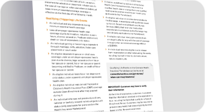 › F or an application made between the 16th and the last day of the month, the effective date of coverage will be the first day of the second following month. Please note: In the case of birth, adoption or placement for adoption or placement in foster care, coverage is effective on the date of birth, adoption, placement for adoption or placement in foster care. In the case of marriage or in the case where an individual loses minimum essential coverage, coverage is effective on the first day of the following month. Qualifying (Triggering) Life Events › An in dividual and any dependents losing minimum essential health coverage › L oss of employer-sponsored health plan coverage due to termination, reduction in work hours, divorce, separation, Medicare entitlement, death or loss of dependent child status › An individual gaining or bec oming a dependent through marriage, birth, adoption, foster care placement or court order › An eligible dependent spouse or child loses coverage under an employer-sponsored health plan due to divorce, legal separation from his or her spouse or parent, his or her spouse or parent becoming entitled to Medicare, or death of his or her spouse or parent › An eligible in dividual loses his or her dependent child status under a parent’s employer-sponsored health plan › An eligible individual w as denied Medicaid or Children’s Health Insurance Plan (CHIP) coverage outside Open Enrollment after they applied during it › An individual who w as not previously a citizen, national or lawfully present individual gains such status (only applicable for plans sold on the Health Insurance Marketplace) › An individual e xperiencing an error in enrollment › An individual adequa tely demonstrating that the plan or issuer substantially violated a material provision of the contract in which he or she is enrolled › An individual bec oming newly eligible or newly ineligible for advance payments of the premium tax credit or experiencing a change in eligibility for cost-sharing reductions › An eligible individual mo ves to a new address and had prior coverage for at least one day in the 60 days before their move › Ne w coverage becoming available to an individual or enrollee as a result of a permanent move › An Indian, as defined b y section 4 of the Indian Health Care Improvement Act, may enroll in a qualified health plan or change from one qualified health plan to another one time per month (only applicable to the Marketplace) › An eligible individual or enr ollee demonstrates to the Exchange, in accordance with guidelines issued by the U.S. Department of Health and Human Services (HHS), that he or she meets other exceptional circumstances as the Exchange may provide (only applicable to the Marketplace) › An eligible individual ne wly gains access to an employer’s offer to help with the cost of coverage through either an individual coverage HRA or a QSEHRA › An individual bec omes eligible due to release from incarceration or other extenuating life events, including, but not limited to, domestic abuse, natural disasters, etc. MEDICAL PLANS CONTINUED Qualifying Life Events on the Colorado Health Insurance Marketplace can be found at connectforhealthco.com/get-started/ when-can-i-buy-insurance/ IMPORTANT: Customers may have to verify their information At the time of application, customers must attest that the information provided on the application is true, including the facts that qualify for a Special Enrollment Period. Customers may be required to provide documents that prove eligibility to enroll based on the life-event experience. Most people who qualify for a Special Enrollment Period and want to change plans may have a limited number of plan “metal” categories to choose from (instead of all four) during their Special Enrollment Period.