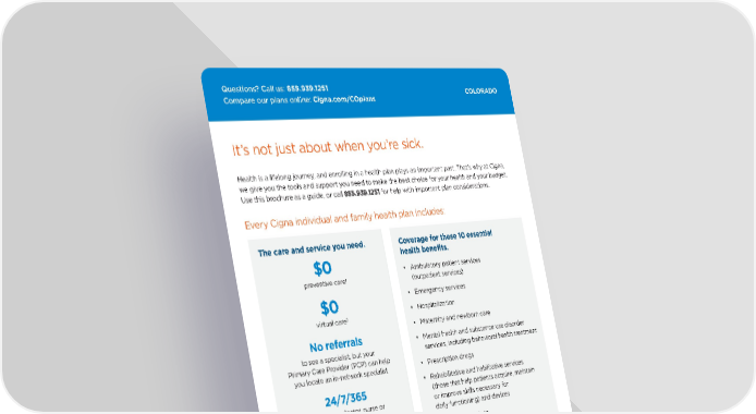 COLORADO Questions? Call us: 855.939.1251 Compare our plans online: Cigna.com/COplans 2 Coverage for these 10 essential health benefits. • Ambulatory patient services (outpatient services) • Emergency services • Hospitalization • Maternity and newborn care • Mental health and substance use disorder services, including behavioral health treatment • Prescription drugs • Rehabilitative and habilitative services (those that help patients acquire, maintain or improve skills necessary for daily functioning) and devices • Laboratory services • Preventive and wellness services and chronic disease management • Pediatric services, including oral and vision care 3 It’s not just about when you’re sick. Health is a lifelong journey, and enrolling in a health plan plays an important part. That’s why at Cigna, we give you the tools and support you need to make the best choice for your health and your budget. Use this brochure as a guide, or call 855.939.1251 for help with important plan considerations. 1. Plans may vary. Includes eligible in-network preventive care services. Some preventive care services may not be covered, including most immunizations for travel. Reference plan documents for a list of covered and non-covered preventive care services. 2. Cigna provides access to dedicated virtual care through a national telehealth provider, MDLIVE located on myCigna, as part of your health plan. Providers are solely responsible for any treatment provided to their patients. Video chat may not be available in all areas or with all providers. This service is separate from your health plan’s network and may not be available in all areas. $0 virtual care benefit for minor acute medical care not available for all plans. HSA plans and non-minor acute medical care may apply a copay, coinsurance or deductible. Virtual care does not guarantee that a prescription will be written. Refer to plan documents for complete description of virtual care services and costs, including other telehealth/telemedicine benefits. For IL customers, a primary care provider referral may be required for specialist virtual visits. 3. Pediatric dental is not available in all states. Some states have stand-alone dental plans with pediatric services. Additionally, some states have a bundled pediatric dental option for off-exchange consumers. The care and service you need. Every Cigna individual and family health plan includes: Cigna One Guide® which gives you personalized support and help with answers to all your plan questions 24/ 7/3 65 access to a doctor, nurse or customer service representative by phone or at myCigna.com No referrals to see a specialist, but your Primary Care Provider (PCP) can help you locate an in-network specialist $0 preventive care 1 $0 virtual care 2