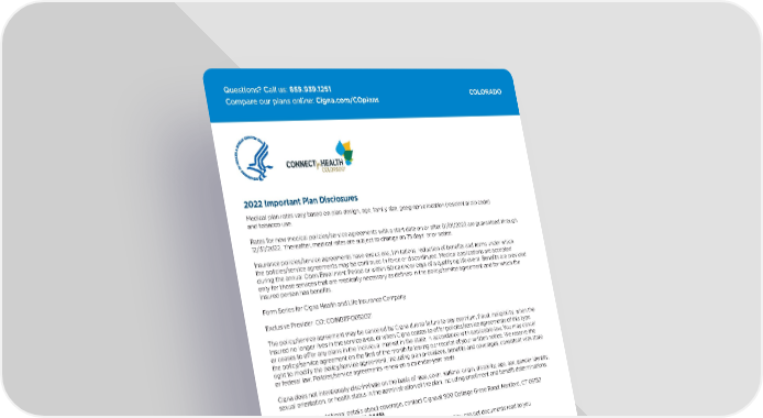 COLORADO Questions? Call us: 855.939.1251 Compare our plans online: Cigna.com/COplans 2022 Important Plan Disclosures Medical plan rates vary based on plan design, age, family size, geographic location (residential zip code) and tobacco use. Rates for new medical policies/service agreements with a start date on or after 01/01/2022 are guaranteed through 12/31/2022. Thereafter, medical rates are subject to change on 75 days’ prior notice. Insurance policies/service agreements have exclusions, limitations, reduction of benefits and terms under which the policies/service agreements may be continued in force or discontinued. Medical applications are accepted during the annual Open Enrollment Period or within 60 calendar days of a qualifying life event. Benefits are provided only for those services that are medically necessary as defined in the policy/service agreement and for which the insured person has benefits. Form Series for Cigna Health and Life Insurance Company: Exclusive Provider: CO: COINDEPO052021 The policy/service agreement may be canceled by Cigna due to failure to pay premium, fraud, ineligibility, when the insured no longer lives in the service area, or when Cigna ceases to offer policies/service agreements of this type or ceases to offer any plans in the individual market in the state, in accordance with applicable law. You may cancel the policy/service agreement on the first of the month following our receipt of your written notice. We reserve the right to modify the policy/service agreement, including plan provisions, benefits and coverages, consistent with state or federal law. Policies/service agreements renew on a calendar-year basis. Cigna does not intentionally discriminate on the basis of race, color, national origin, disability, age, sex, gender identity, sexual orientation, or health status in the administration of the plan, including enrollment and benefit determinations. For costs, and additional details about coverage, contact Cigna at 900 Cottage Grove Road, Hartford, CT 06152 or call 866.GET. CIGNA (866.438.2446) . No-cost language services are available. You can have an interpreter. You can get documents read to you and some sent to you in your language. For help, call us at 866.494.2111 . Servicios de idiomas sin costo. Puede obtener un intérprete. Le pueden leer documentos y que le envíen algunos en español. Para obtener ayuda, llámenos al 866.494.2111 . ACCESS PLAN If you would like more information on: (1) who participates in our provider network; (2) how we ensure that the network meets the health care needs of our members; (3) how our provider referral process works; (4) how care is continued if providers leave our network; (5) what steps we take to ensure medical quality and customer satisfaction; (6) where you can go for information on other plan services and features; you may request a copy of our Access Plan. The Access Plan is designed to disclose all the plan information required under Colorado law, and can be obtained by calling Customer Service or visiting Cigna.com . All Cigna products and services are provided exclusively by or through operating subsidiaries of Cigna Corporation, including Cigna Health and Life Insurance Company, Cigna HealthCare of Arizona, Inc., Cigna HealthCare of Georgia, Inc., Cigna HealthCare of Illinois, Inc., and Cigna HealthCare of North Carolina, Inc. The Cigna name, logo, and other Cigna marks are owned by Cigna Intellectual Property, Inc. 941305 11/21 © 2021 Cigna. Some content provided under license.