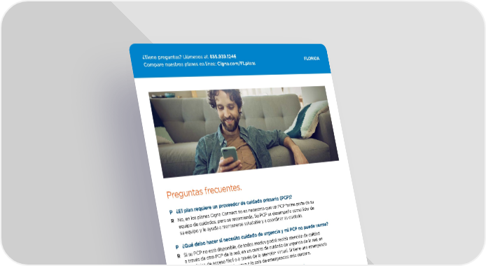 13 FLORIDA ¿Tiene preguntas? Llámenos al: 855.939.1246 Compare nuestros planes en línea: Cigna.com/FLplans Encuentre más respuestas. Esperamos que entienda mejor sus opciones de planes de salud y que considere inscribirse en un plan Cigna Connect para 2022. Para obtener más información, visite Cigna.com/FLplans o llame al 855.939.1246 . Preguntas frecuentes. P ¿El plan requiere un proveedor de cuidado primario (PCP)? R No, en los planes Cigna Connect no es necesario que un PCP forme parte de su equipo de cuidados, pero se recomienda. Su PCP se desempeña como líder de su equipo y le ayuda a mantenerse saludable y a coordinar su cuidado. P ¿Qué debo hacer si necesito cuidado de urgencia y mi PCP no puede verme? R Si su PCP no está disponible, de todos modos podrá recibir atención de calidad a través de otro PCP de la red, en un centro de cuidado de urgencia de la red, en una clínica de acceso fácil o a través de la atención virtual. Si tiene una emergencia que pone en riesgo su vida, vaya a la sala de emergencias más cercana. P ¿Cómo sé si mis medicamentos con receta están cubiertos? R Para encontrar una lista de medicamentos con receta aprobada por el plan, visite Cigna.com/ifp-drug-list .
