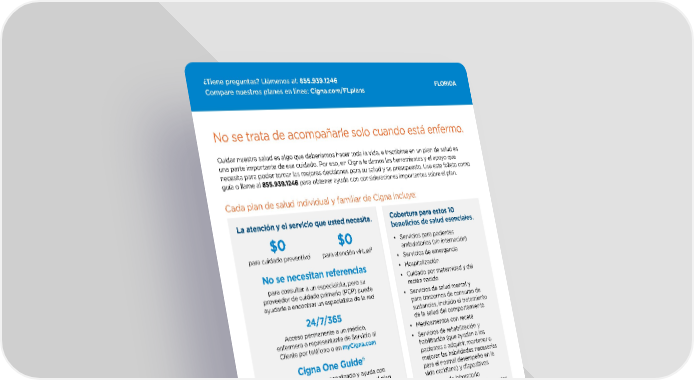 9 FLORIDA ¿Tiene preguntas? Llámenos al: 855.939.1246 Compare nuestros planes en línea: Cigna.com/FLplans Cobertura para estos 10 beneficios de salud esenciales. • Servicios para pacientes ambulatorios (sin internación) • Servicios de emergencia • Hospitalización • Cuidado por maternidad y del recién nacido • Servicios de salud mental y para trastornos de consumo de sustancias, incluido el tratamiento de la salud del comportamiento • Medicamentos con receta • Servicios de rehabilitación y habilitación (que ayudan a los pacientes a adquirir, mantener o mejorar las habilidades necesarias para el normal desempeño en la vida cotidiana) y dispositivos • Servicios de laboratorio • Servicios preventivos y de bienestar y control de enfermedades crónicas • Servicios pediátricos, incluida la atención bucodental y de la vista 3 La atención y el servicio que usted necesita. Cada plan de salud individual y familiar de Cigna incluye: Cigna One Guide® le brinda apoyo personalizado y ayuda con respuestas a todas sus preguntas sobre el plan Las herramientas de transparencia de precios ayudan a estimar costos con anticipación y evitar facturas sorpresa 24/ 7/3 65 Acceso permanente a un médico, enfermera o representante de Servicio al Cliente por teléfono o en myCigna.com No se necesitan referencias para consultar a un especialista, pero su proveedor de cuidado primario (PCP) puede ayudarle a encontrar un especialista de la red $0 para cuidado preventivo 1 $0 para atención virtual 2 No se trata de acompañarle solo cuando está enfermo. Cuidar nuestra salud es algo que deberíamos hacer toda la vida, e inscribirse en un plan de salud es una parte importante de ese cuidado. Por eso, en Cigna le damos las herramientas y el apoyo que necesita para poder tomar las mejores decisiones para su salud y su presupuesto. Use este folleto como guía o llame al 855.939.1246 para obtener ayuda con consideraciones importantes sobre el plan. 1. Los planes pueden variar. Incluye servicios de cuidado preventivo dentro de la red que cumplen con los requisitos. No todos los servicios de cuidado preventivo están cubiertos, lo que incluye la mayoría de las vacunas para viajes. Consulte los documentos del plan, donde encontrará una lista de servicios de cuidado preventivo cubiertos y no cubiertos. 2. Cigna le permite acceder a servicios de atención virtual exclusivos a través de un proveedor nacional de servicios de telesalud, MDLIVE, desde myCigna, como parte de su plan de salud. Los proveedores son exclusivamente responsables por cualquier tratamiento brindado a sus pacientes. Es posible que los servicios de videochat no estén disponibles en todas las áreas o con todos los proveedores. Este servicio es independiente de la red de su plan de salud y es posible que no esté disponible en todas las áreas. El beneficio de atención virtual de $0 para atención médica de condiciones agudas menores no está disponible para todos los planes. Es posible que se aplique un copago, coseguro o deducible para los planes con HSA y la atención médica de condiciones agudas no menores. La atención virtual no garantiza que se emitirá una receta. Consulte los documentos del plan para tener una descripción completa de los servicios de atención virtual y sus costos, incluidos otros beneficios de telesalud/telemedicina. Para los clientes de IL, es posible que se necesite una referencia del proveedor de cuidado primario para las visitas virtuales a un especialista. 3. La atención dental pediátrica no está disponible en todos los estados. Algunos estados tienen planes dentales independientes con servicios pediátricos. Además, algunos estados tienen una opción de cobertura dental pediátrica agrupada para consumidores fuera del Intercambio.