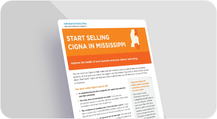 942568 10/21 © 2021 Cigna. Some content provided under license. START SELLING CIGNA IN MISSISSIPPI Improve the health of your business and your clients’ well-being. Call the Cigna Broker Support Team to get appointed. 877.244.6215 • Monday–Friday • 8:00 am–8:00 pm ET Cigna pays simple and reliable medical and dental commissions, on-time and twice per month. 2 Cigna pays the same commission amounts on medical OEP and SEP sales so you can build your portfolio year-round. Plus, with Cigna Dental, you’ll be compensated based on a percentage of the entire premium. And, with a 15% family premium discount, you can sell Cigna Dental to eligible dependents. 3 You can count on Cigna to help make sure you have the tools you need to keep your business growing. And to give your clients the support and information they need to make smarter choices about their health. Cigna will help your clients get the most out of their plans, so you can focus on business. See what makes Cigna easy to sell: › An established brand with a reputation for supporting customers and their well-being. › The tools, data and information you need. Cigna provides on-demand education materials, real-time personalized information, co-branded marketing materials and more. › The confidence of knowing your clients are taken care of. Cigna’s teams support your clients 24/7/365 with live phone support and easy-to-use online tools so you can focus on building your business. › Helping your clients get the most out of their plan. With affordable plan options to fit their needs and budget, including $0 deductibles and benefits. 1 › Dedicated broker support team. Cigna is here for you in the moments that matter. Available Monday–Friday, 8:00 am–8:00 pm ET. › Broad product portfolio of competitive products to sell. Including medical, dental, vision, hearing and Medicare – to give you the flexibility to address your clients’ health needs and sell year-round. Individual and Family Plans Cigna Health and Life Insurance Company, Inc. 1. Based on internal data for 2021. Final premium amount is after any applicable subsidy, based on household size and income, from the federal government is applied. 2. Commission payment releases subject to minimum threshold. EFT payment will release with $5 or more, and mailed paper checks will release with $300 or more. 3. For each subsequent customer added to a primary policy, a 15% discount is applied to the standard rate. Discount is automatically applied in the quote tool.