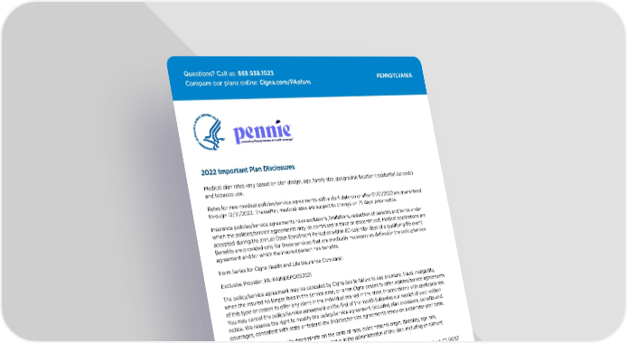 2022 Important Plan Disclosures Medical plan rates vary based on plan design, age, family size, geographic location (residential zip code) and tobacco use. Rates for new medical policies/service agreements with a start date on or after 01/01/2022 are guaranteed through 12/31/2022. Thereafter, medical rates are subject to change on 75 days’ prior notice. Insurance policies/service agreements have exclusions, limitations, reduction of benefits and terms under which the policies/service agreements may be continued in force or discontinued. Medical applications are accepted during the annual Open Enrollment Period or within 60 calendar days of a qualifying life event. Benefits are provided only for those services that are medically necessary as defined in the policy/service agreement and for which the insured person has benefits. Form Series for Cigna Health and Life Insurance Company: Exclusive Provider: PA: PAINDEPO052021 The policy/service agreement may be canceled by Cigna due to failure to pay premium, fraud, ineligibility, when the insured no longer lives in the service area, or when Cigna ceases to offer policies/service agreements of this type or ceases to offer any plans in the individual market in the state, in accordance with applicable law. You may cancel the policy/service agreement on the first of the month following our receipt of your written notice. We reserve the right to modify the policy/service agreement, including plan provisions, benefits and coverages, consistent with state or federal law. Policies/service agreements renew on a calendar-year basis. Cigna does not intentionally discriminate on the basis of race, color, national origin, disability, age, sex, gender identity, sexual orientation, or health status in the administration of the plan, including enrollment and benefit determinations. For costs, and additional details about coverage, contact Cigna at 900 Cottage Grove Road, Hartford, CT 06152 or call 866.GET. CIGNA (866.438.2446) . For questions about enrolling through Pennie, visit pennie.com or call the Pennie Call Center at 1-844-844-8040 . No-cost language services are available. You can have an interpreter. You can get documents read to you and some sent to you in your language. For help, call us at 866.494.2111 . Servicios de idiomas sin costo. Puede obtener un intérprete. Le pueden leer documentos y que le envíen algunos en español. Para obtener ayuda, llámenos al 866.494.2111 . All Cigna products and services are provided exclusively by or through operating subsidiaries of Cigna Corporation, including Cigna Health and Life Insurance Company, Cigna HealthCare of Arizona, Inc., Cigna HealthCare of Georgia, Inc., Cigna HealthCare of Illinois, Inc., and Cigna HealthCare of North Carolina, Inc. The Cigna name, logo, and other Cigna marks are owned by Cigna Intellectual Property, Inc. 941315 08/21 © 2021 Cigna. Some content provided under license. PE N N SYLVAN IA Questions? Call us: 855.938.1023 Compare our plans online: Cigna.com/PAplans